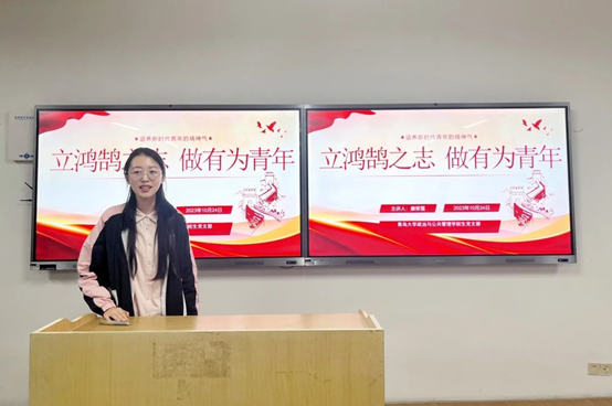 康荣雪围绕青年内涵、青年为何立志以及如何立志三方面展开宣讲。首先,以“何为青年?青年何为?”这一问题为引导,依次阐释了青年的内涵与青年的志向;其次,她结合航天员桂海潮和南京大学物理公司副经理缪峰的故事,从三个方面说明了“雏雁”如何树立鸿鹄之志:一是要坚定理想信念,秉持初心使命,自觉将共产主义远大理想与中国特色社会主义共同理想相结合,将个人发展和社会发展相统一,在思想政治上始终于党中央保持一致;二是要勇于不懈奋斗,不断超越自我。世上无捷径,唯有奋斗才能抵达梦想的彼岸,青年要为实现第二个“一百年”奋斗目标顽强拼搏;三是要练就过硬本领,勇担职责使命。青年要胸怀大局,不为一己之私利,着眼于长远利益,不断凝聚稳步前行的自信和力量。