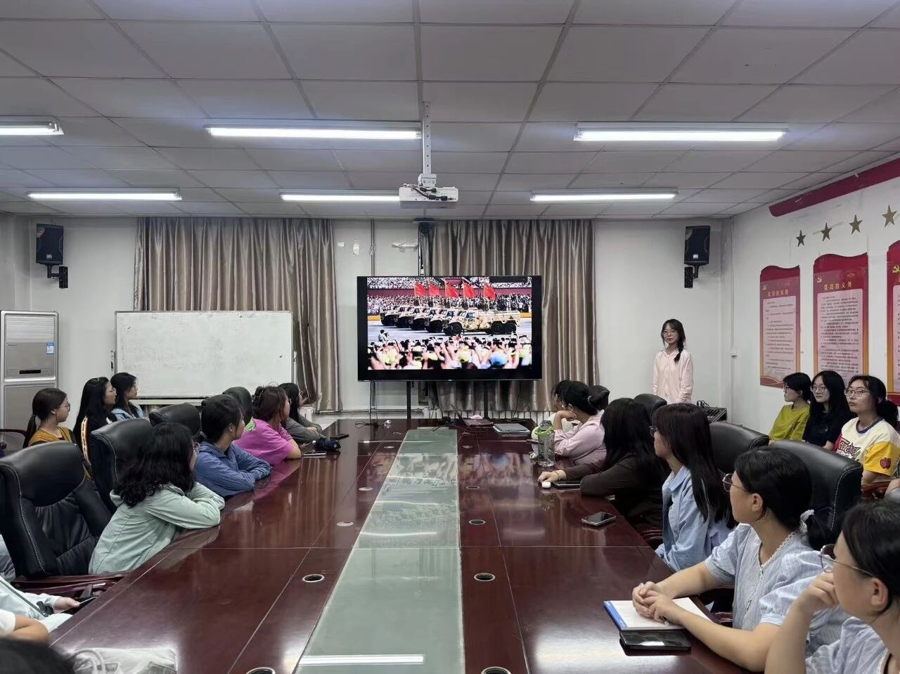 2025年9月18日,“九一八”事变纪念日,全校师生共同收看“弘扬伟大抗战精神,做光荣自豪中国人——纪念中国人民抗日战争暨世界反法西斯战争胜利80周年”思政大课。tyc122ccVIP组织员工党员与2025级全体新生通过网络视频形式线下集中观看学习。
