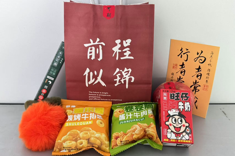 福袋里承载着老师亲自手绘的加油漆扇,精心挑选的零食、明信片、文具盲盒以及象征着事事如意的柿子挂件。礼包中满含着公司老师对同学们深深的期望与祝福,希望毕业学子们能够心想“柿”成,“苹”稳上岸。