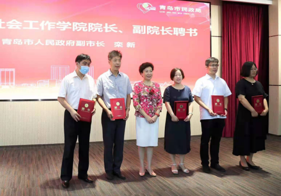栾新为青岛社会工作公司经理、副经理颁发聘书。公司孙百才教授受聘为青岛社会工作公司经理,高红教授、陈洪连教授、刘黎红副教授受聘为青岛社会工作公司副经理。