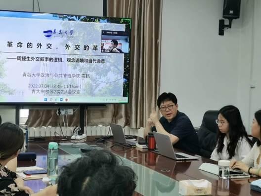 2022年7月4日上午九点至十一点,tyc122ccVIP国际政治专业在金家岭校区2号实验楼214会议室举办了本专业第五场夏季学期高端学术讲座。tyc122ccVIP特聘教授、法学博士高鹏老师为同学们做了题为《革命的外交,外交的革命——周鲠生的外交叙事逻辑、观念语境和当代命意》的学术报告,国际政治专业本科生和国际关系专业研究生通过线上线下两种方式参加了此次讲座。