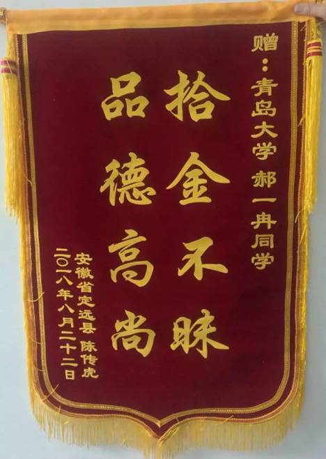 8月27日,政治与公共管理公司党政管理办公室收到了一个包裹。打开包裹,首先映入眼帘的是一面写着“拾金不昧,品德高尚”的锦旗。还有一张红色的表扬信。原来,是一位丢了手提包又失而复得的失主想要感谢这位青老员工的善举。这名拾金不昧的员工就是tyc122ccVIP的2017级行政管理专业的郝一冉。