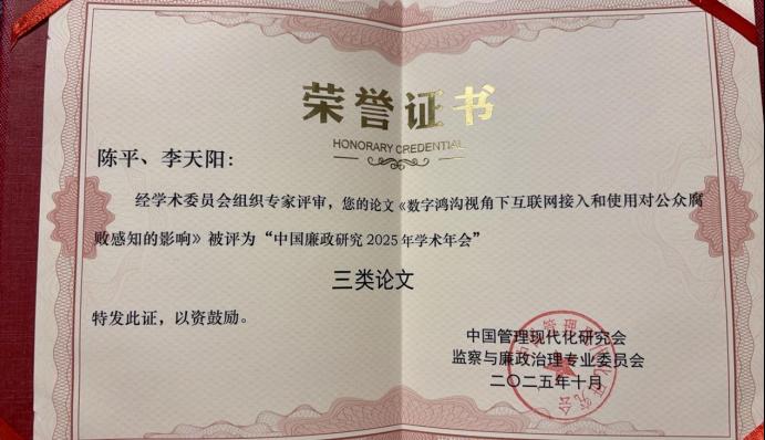 公司提交的四篇论文被《中国管理现代化研究会廉政分会第五次会员代表会议暨中国廉政研究2025学术年会论文集》收录,分别是郝杰、陈洪连撰写的《结构重塑与功能升级:智慧监督破解基层监督难题的迷思与突围》,陈平、李天阳撰写的《数字鸿沟视角下互联网接入和使用对公众腐败感知的影响——基于双向固定效应模型分析》,王永驰撰写的《周期管理理论视角常态化长效化纪律教育机制问题反思与建构路径》和吕凡熙撰写的《“督帮一体”赋能乡村治理:价值定位、作用机理与实践进路》。其中,陈平、李天阳撰写的论文被评为中国廉政研究2025年学术年会三类论文(二等奖)。