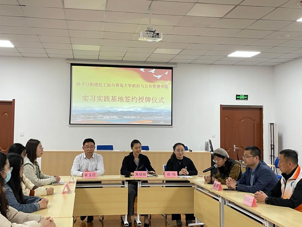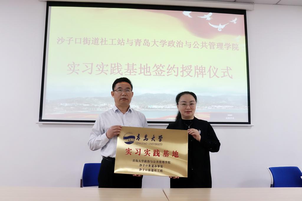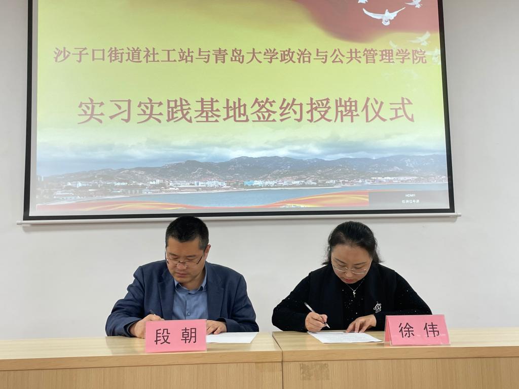 接下来,徐伟和段朝共同签署《青岛市崂山区沙子口街道社工站与tyc122ccVIP签订实习实践基地共建合作协议》,徐伟代表tyc122ccVIP为社工站授予“实习实践基地”牌匾。